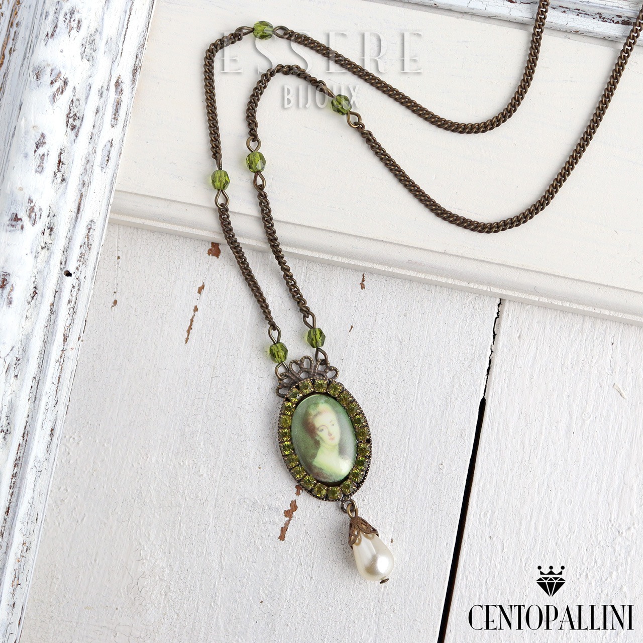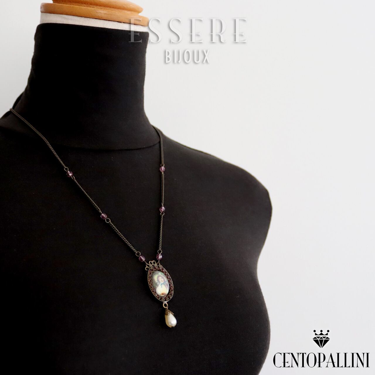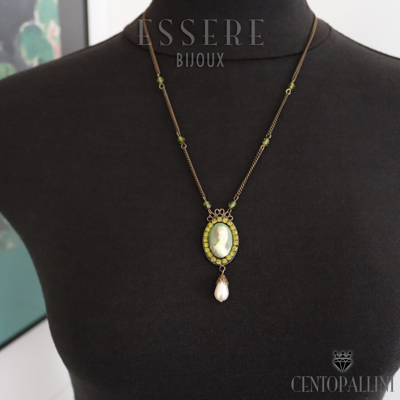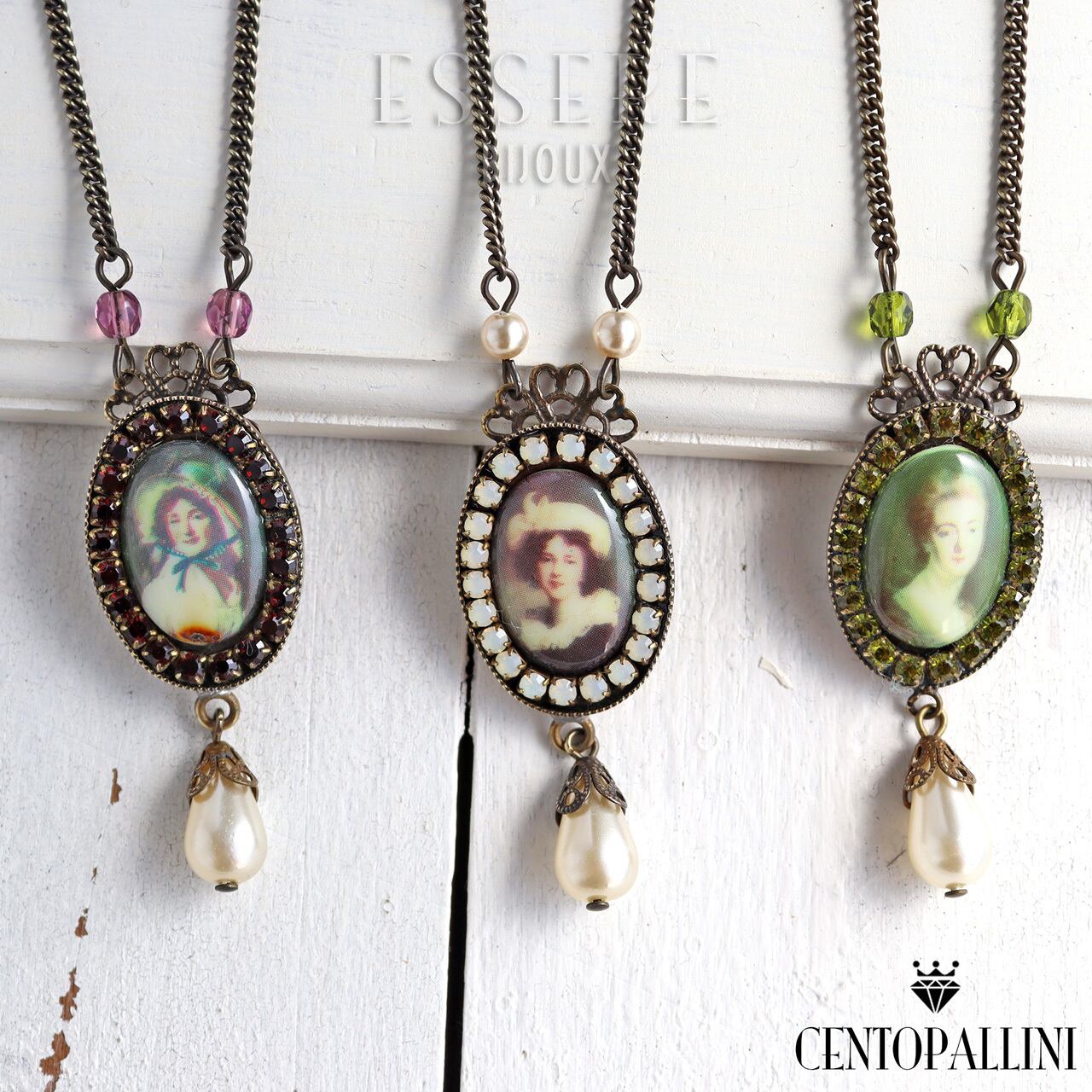 アンティークな肖像画がプリントされたカボションが美しい、ポートレイトカボションのペンダントです。肖像画の周りは小さなスワロのラインストーンで縁取り、上品に仕上げてあります。