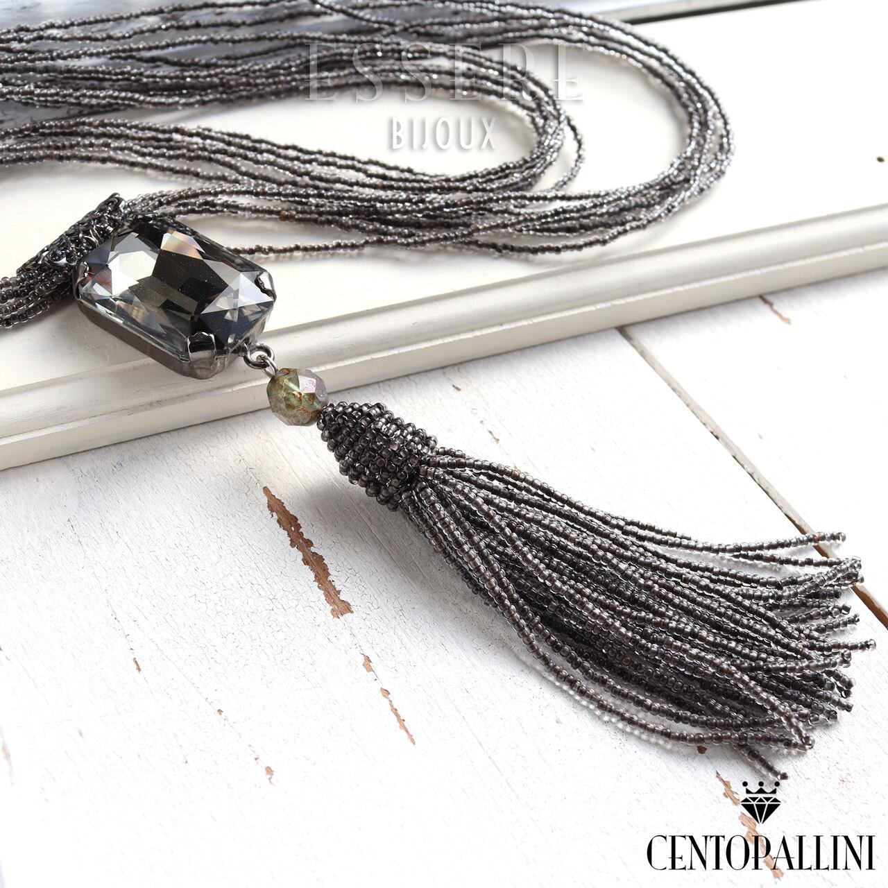 このネックレスは、繊細な極小ビーズで編まれたタッセルと、スワロフスキのオクタゴンクリスタルが織りなす上品な輝きが特徴です。