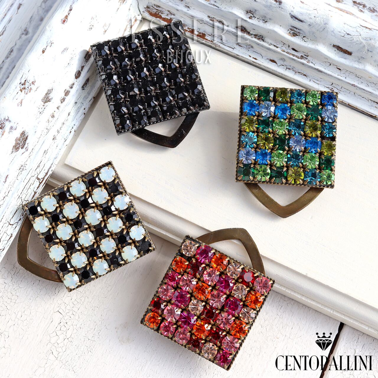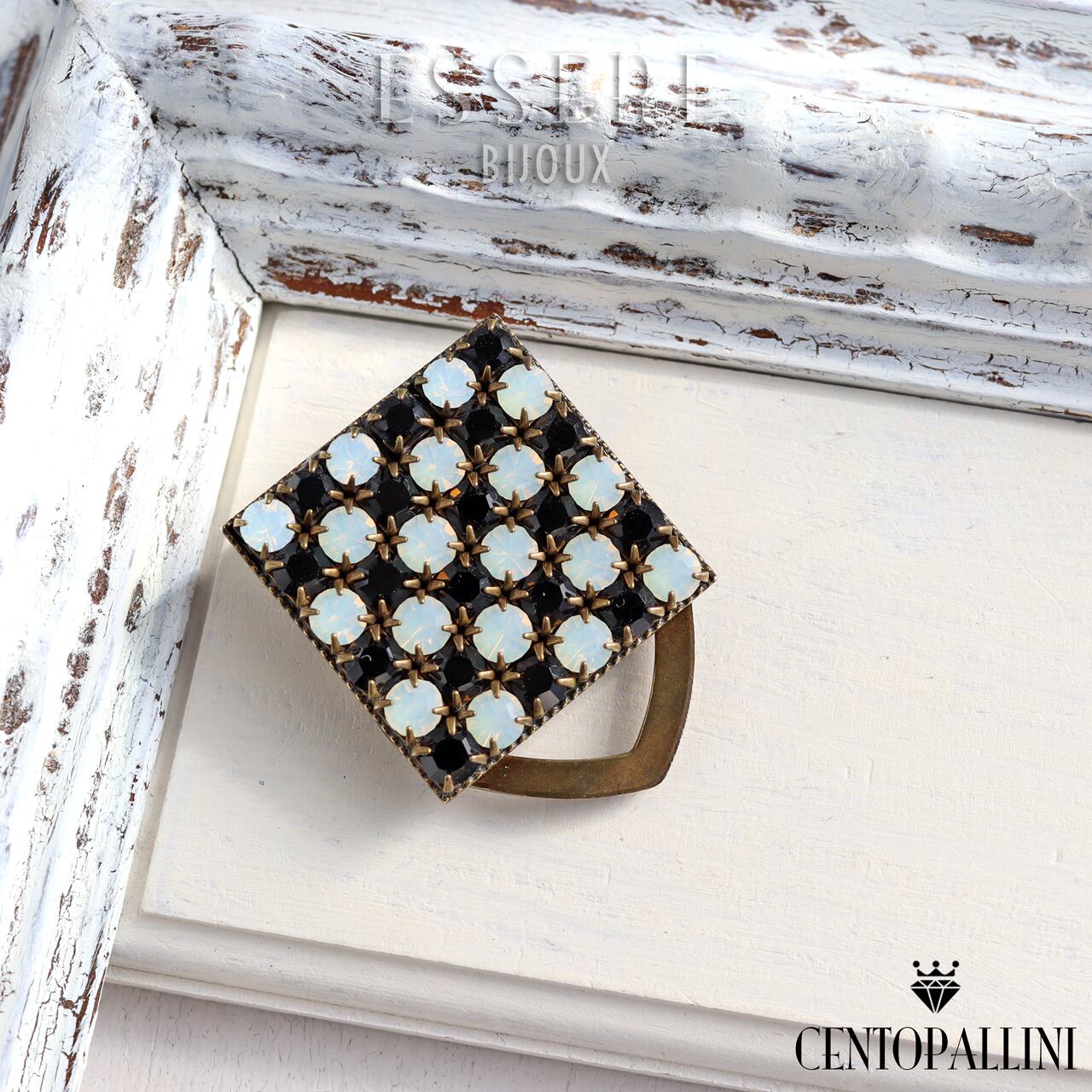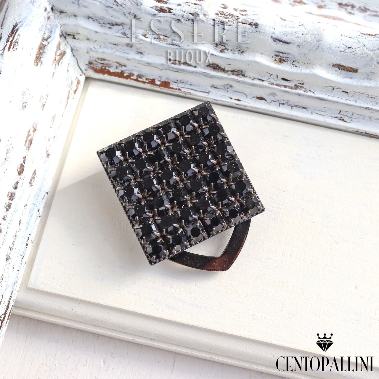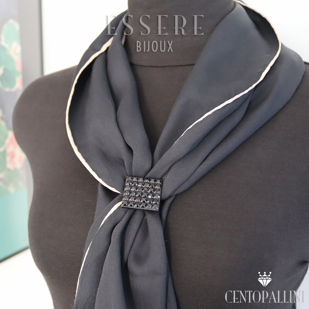 「モノクロームの美・シックなスクエアスカーフクリップ」はスクエアフレームにプレシオサクリスタルを敷き詰めた魅力のアイテムです。