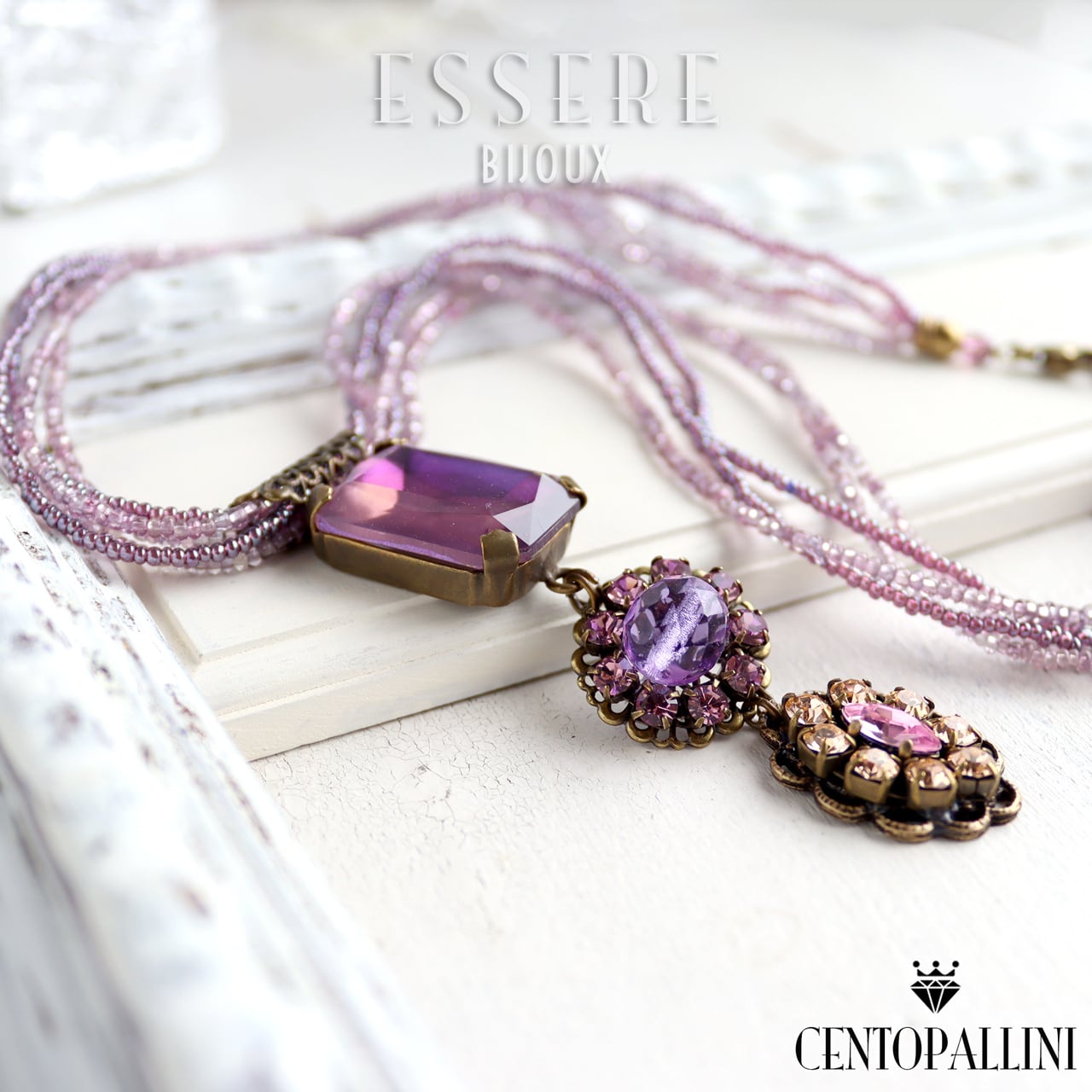春の訪れを感じさせる「モーブドリーム・クリスタルビジューネックレス」は、モーブ、ライトアメジスト、ライトピーチのクリスタルが織り成す、華やかで優雅な一品です。大粒のオクタゴンカットクリスタルは、CentoPalliniならではのオリジナルカラーで、見る角度によって異なる表情を見せ、輝きが止まりません。