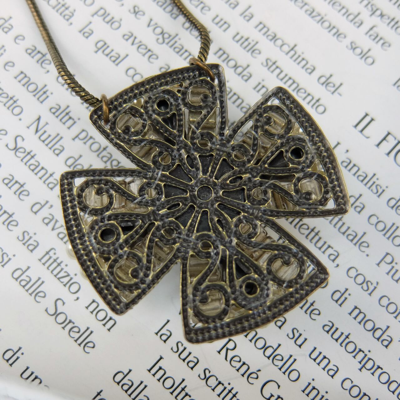 中央にシフォンで包んだクリスタルのカボションを配し、クロスメダル風のロングネックレスです。