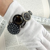 グレーガラスパールとセピアカラーのカボションが絶妙に組み合わさり、上品で大人っぽい印象を与えます。特に開閉可能なバングル仕様なので、快適な装着感を実現しています。