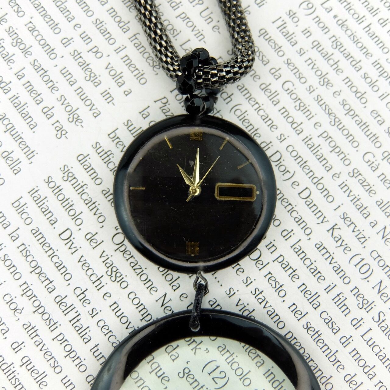 古い時計の文字盤をレジンで両面に埋め込みました。表と裏の時計のデザインが異なり、気分によって変えられる楽しさがあります。時を刻むことはありませんが、魅力的なディテールでその個性が際立ちます。