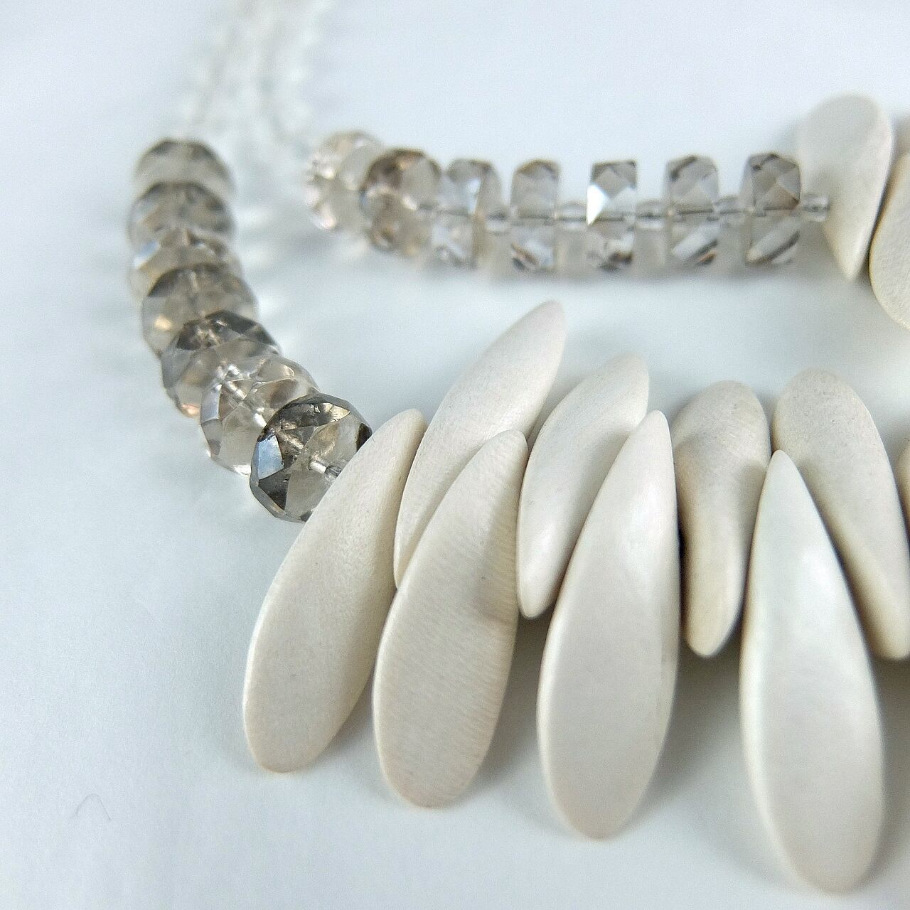 映える存在感を放つ、エッセレ・ホワイトウッドティアドロップモチーフ ステートメント ネックレスです。