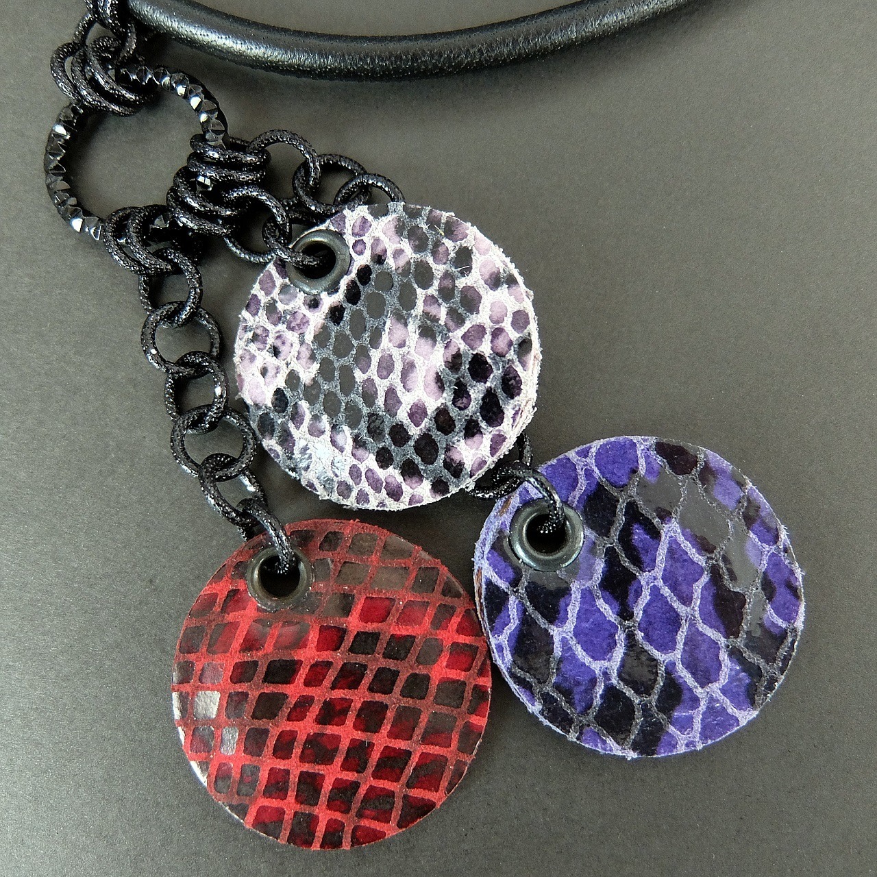 革のディスクチャームがアクセントになった、パイソン(ミックスカラー)とクロコダイル(ブラックカラー)のスタンプレザーネックレスです。