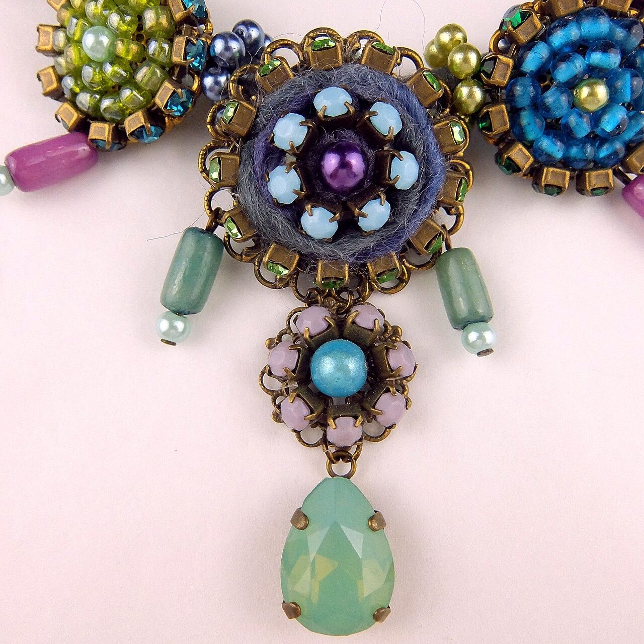 中心部のモチーフにはウールを巻いて、またさまざまなヴェネツィアンガラスとカラーパールも全体のカラートーンに合わせました。