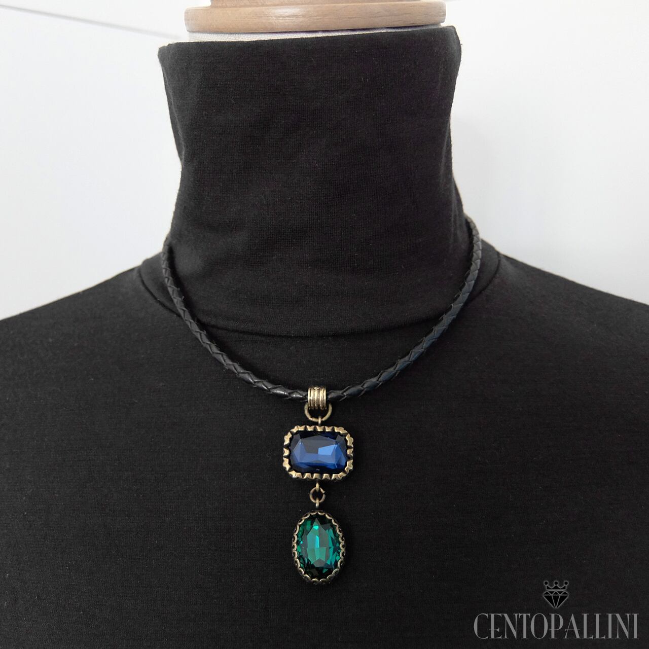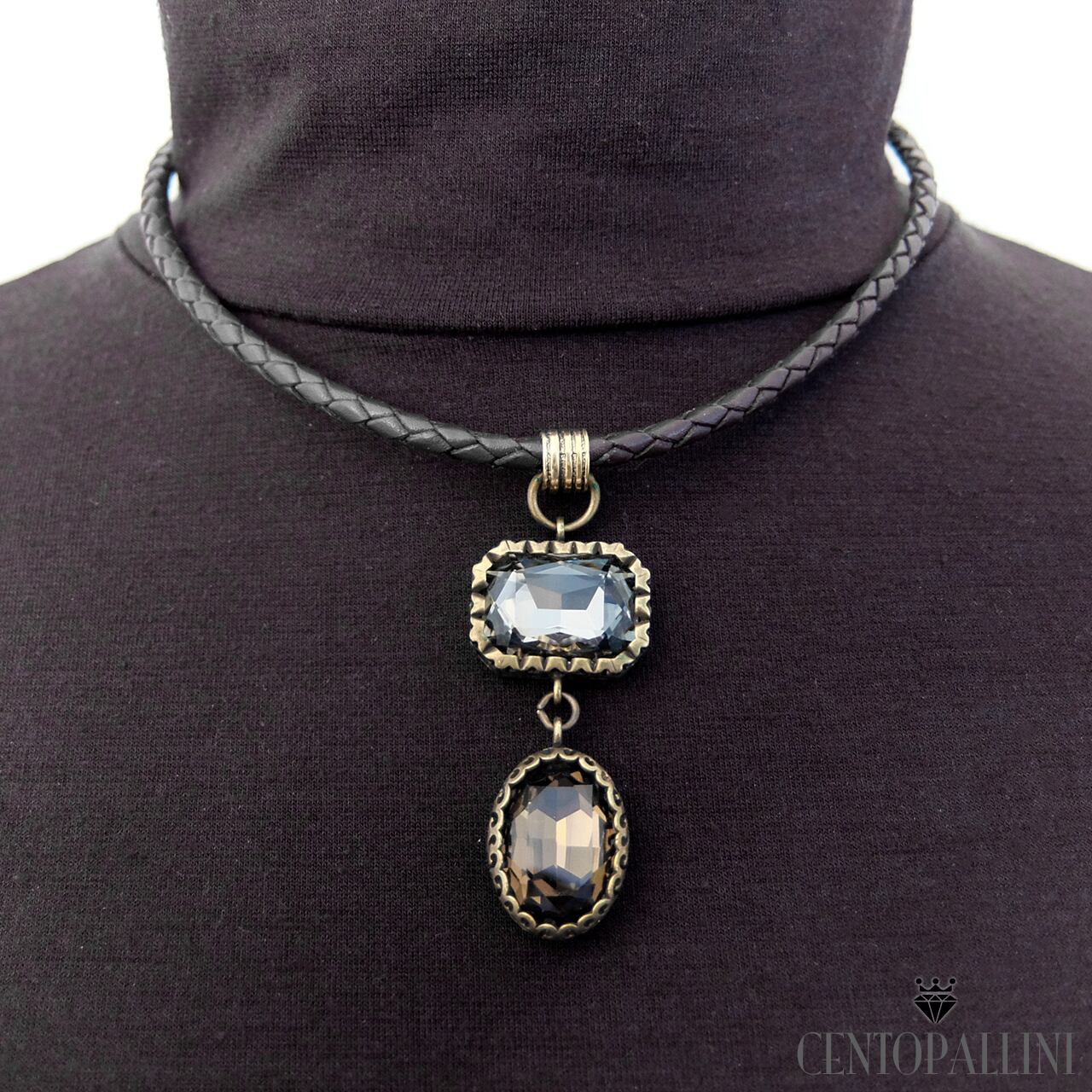 個性的なデザインが魅力の大きなクリスタルラインストーンと本革編み紐のショートネックレスです。