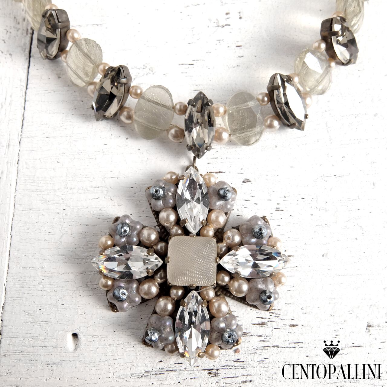 このネックレスの素材にもこだわりました。スワロフスキーのクリスタルを贅沢に使い、煌めきと光を放ちます。また、ヴィンテージのオバールパーツもアクセントになり、よりシックな印象を与えます。