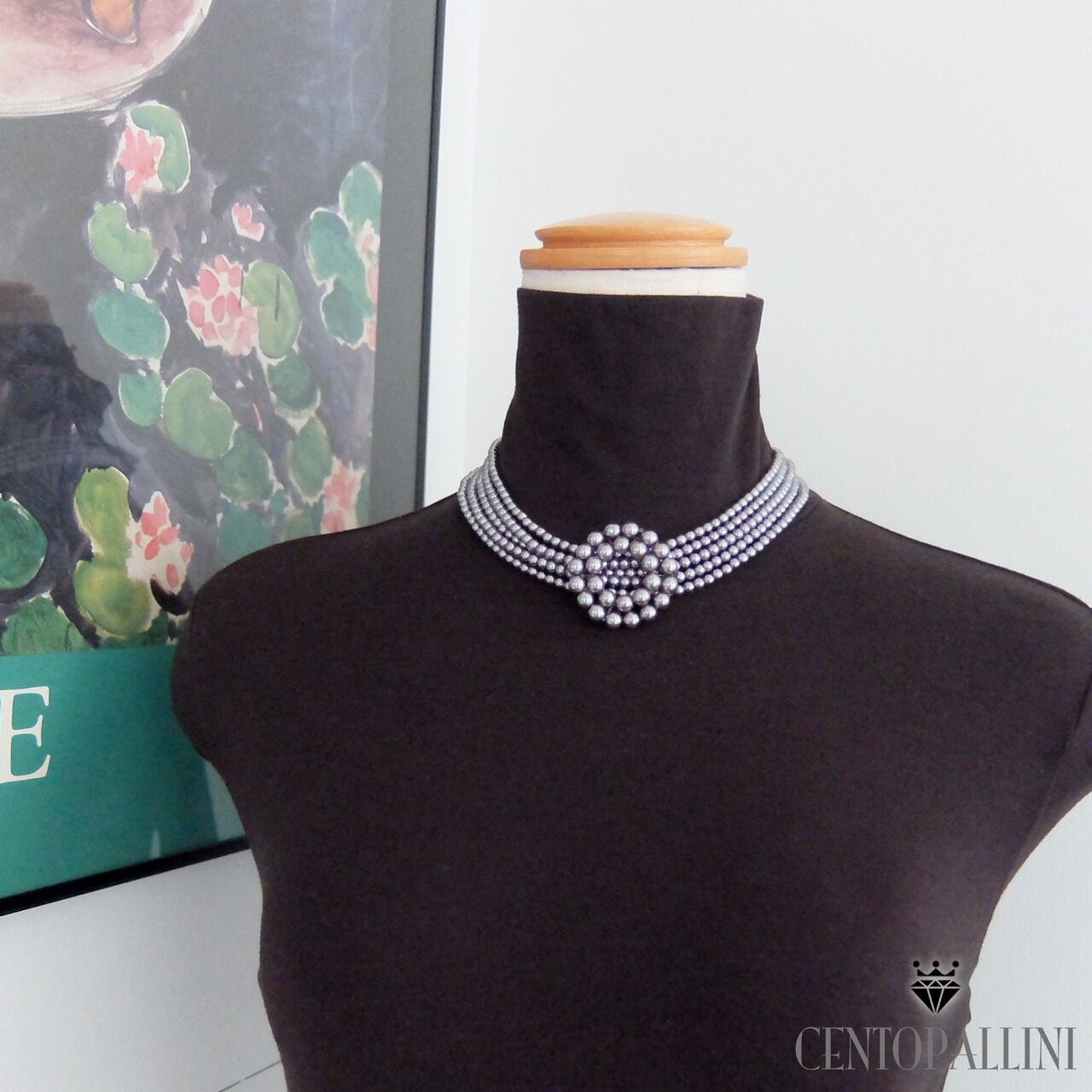 円状の6ミリのガラスパールモチーフに、5連の4ミリのガラスパールをベルトのように通したエレガントなチョーカータイプのネックレスです。