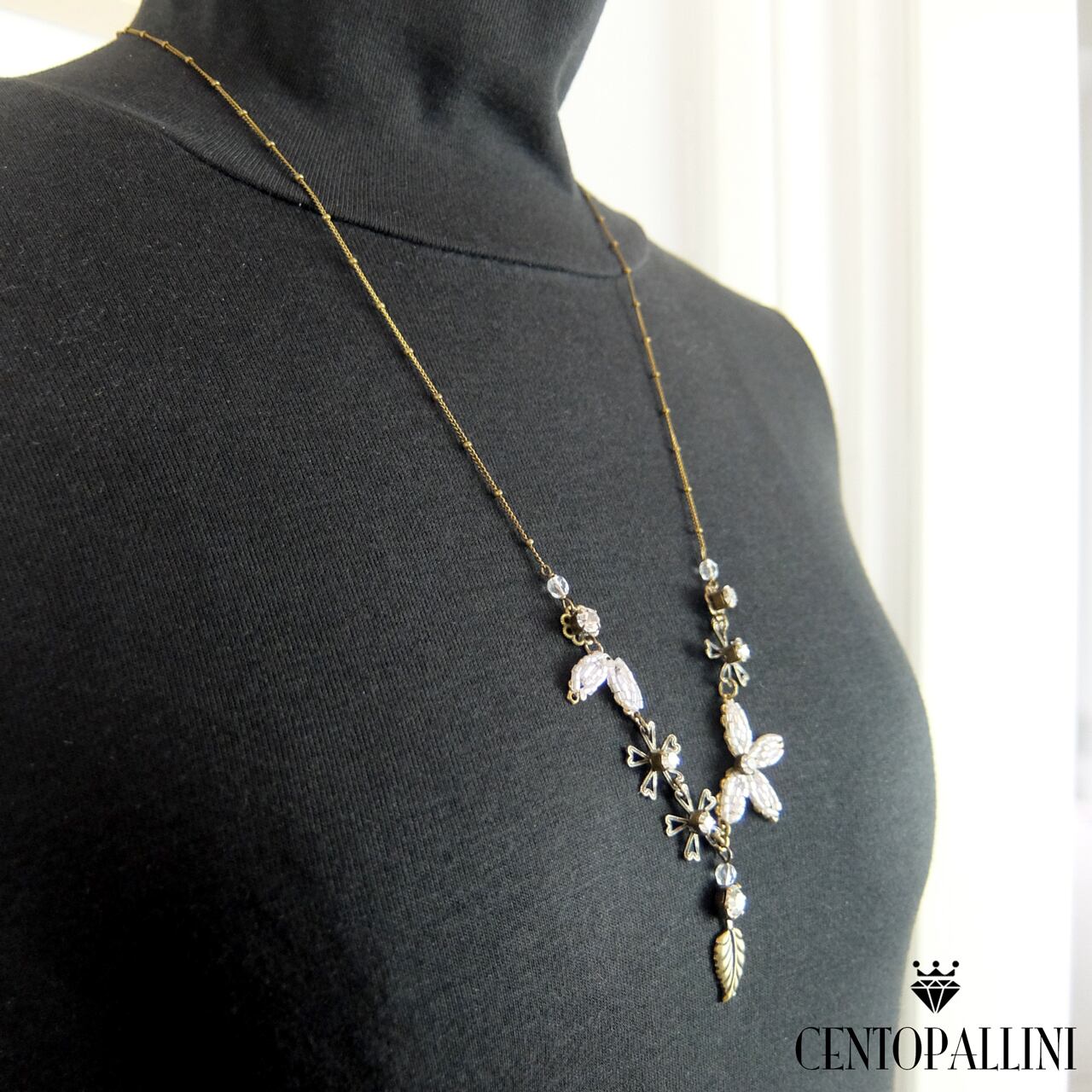 繊細な透かし彫りモチーフにクリスタルやビーズが刺繍されて、まるで小さなブーケのような美しいネックレスです。ベースとなるメタルはアンティークブラスカラー。クリスタルとの組み合わせで深みのある陰影を作り出します。品のあるデザインはどんなコーディネートにもマッチし、華やかさをプラスしてくれます。