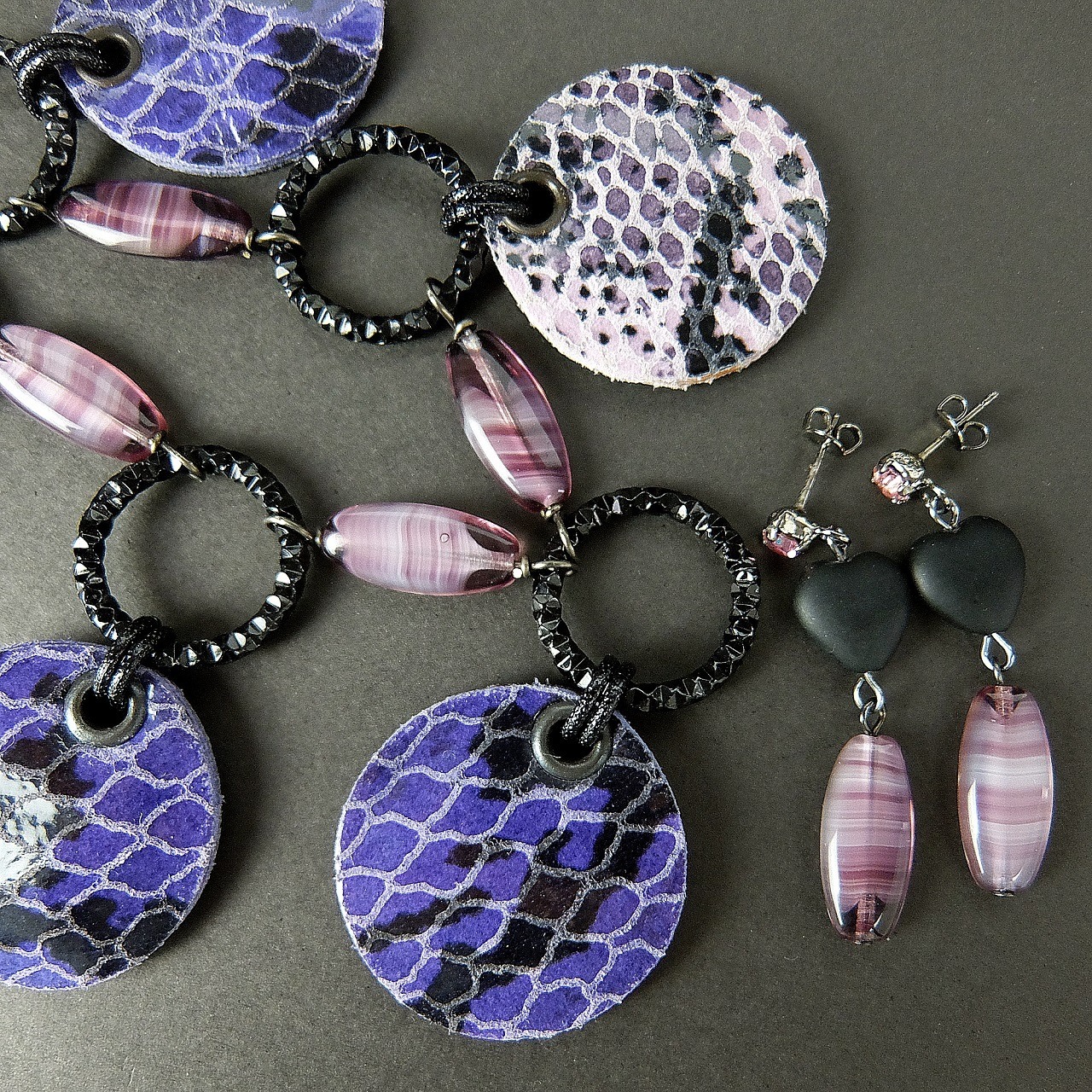 パープル&ピンクカラーは、スタンプレザーディスクを紫のチェコガラスと合わせてショートネックレスを作りました。