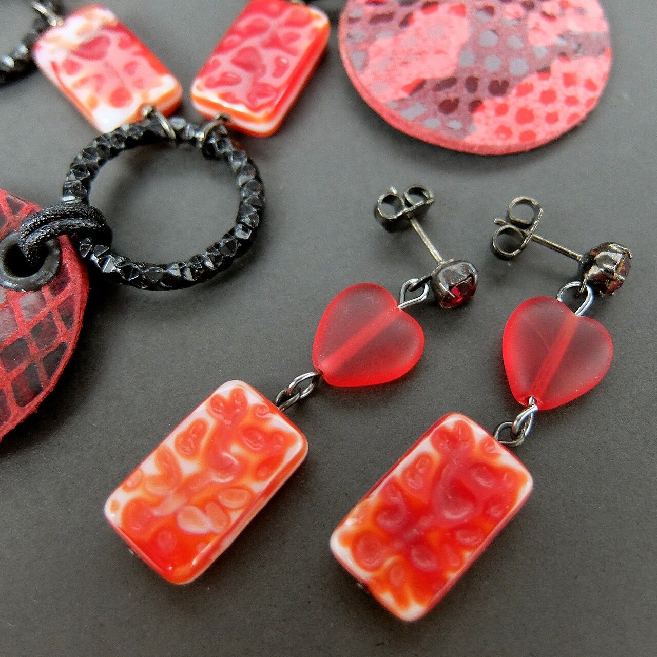 レッド&ブラックカラーは、スタンプレザーディスクを長四角のヴェネツィアンガラスと合わせてショートネックレスを作りました。