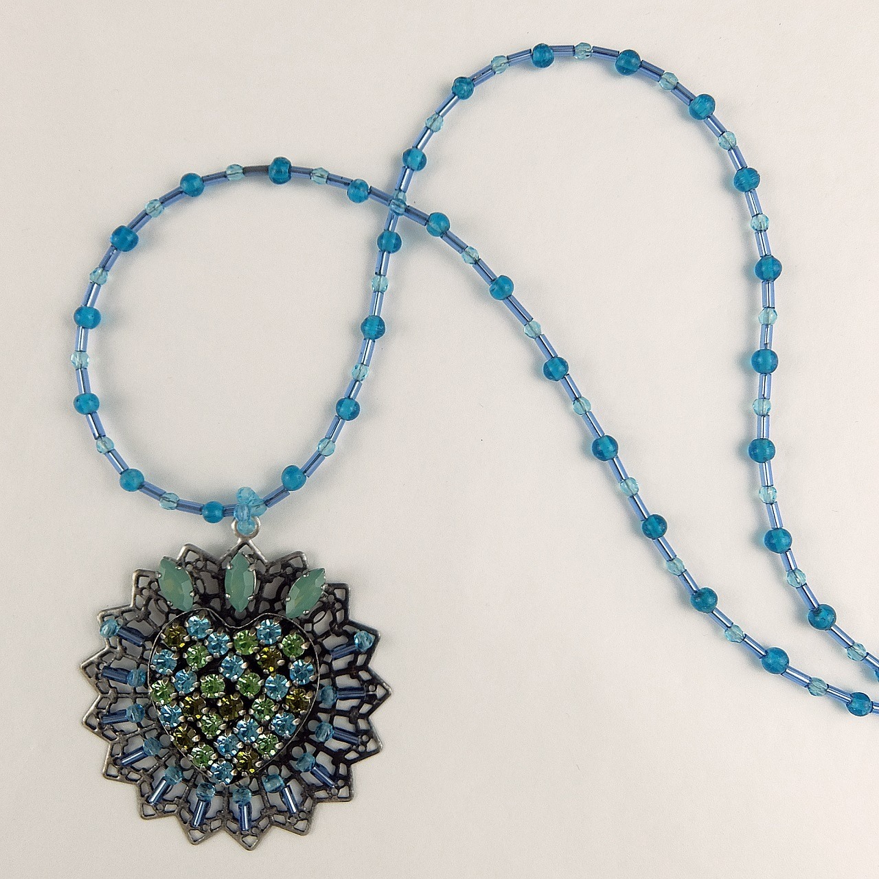 華やかなラインストーンハート型ときれいな水色のスレンダービーズを透かし彫りにビージングしたロングネックレスです。