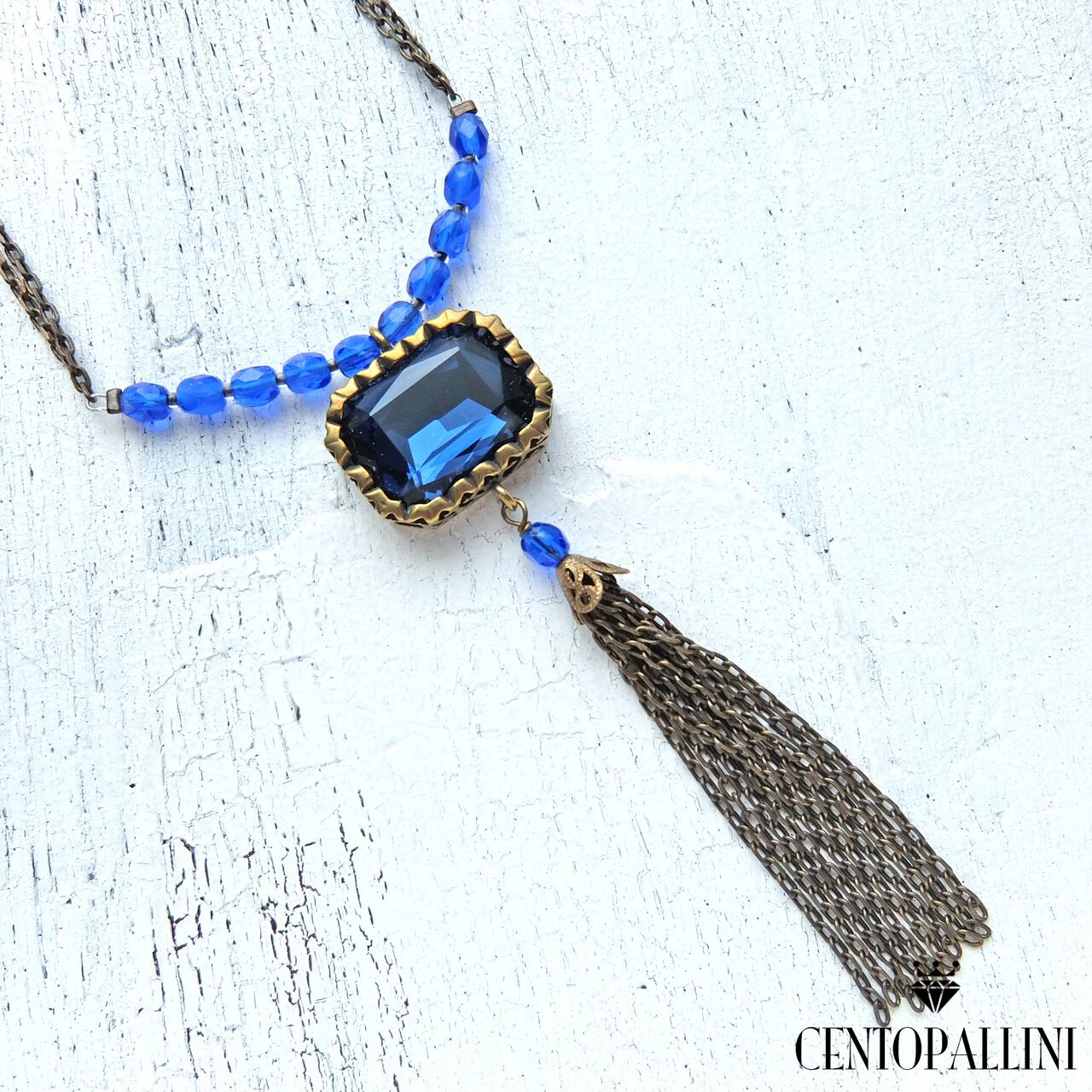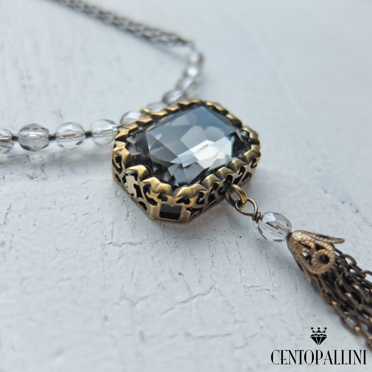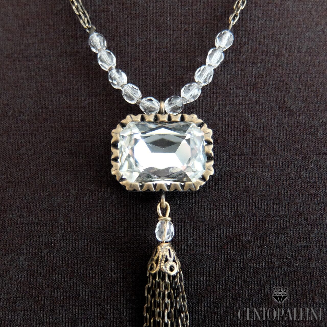 個性的なデザインが魅力の大きなオクタゴン クリスタルの下に、真鍮の細チェーンをフリンジをあしらったショートネックレスです。