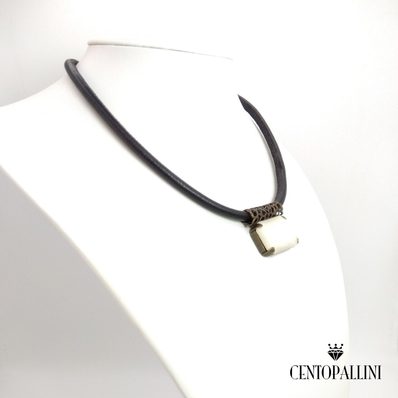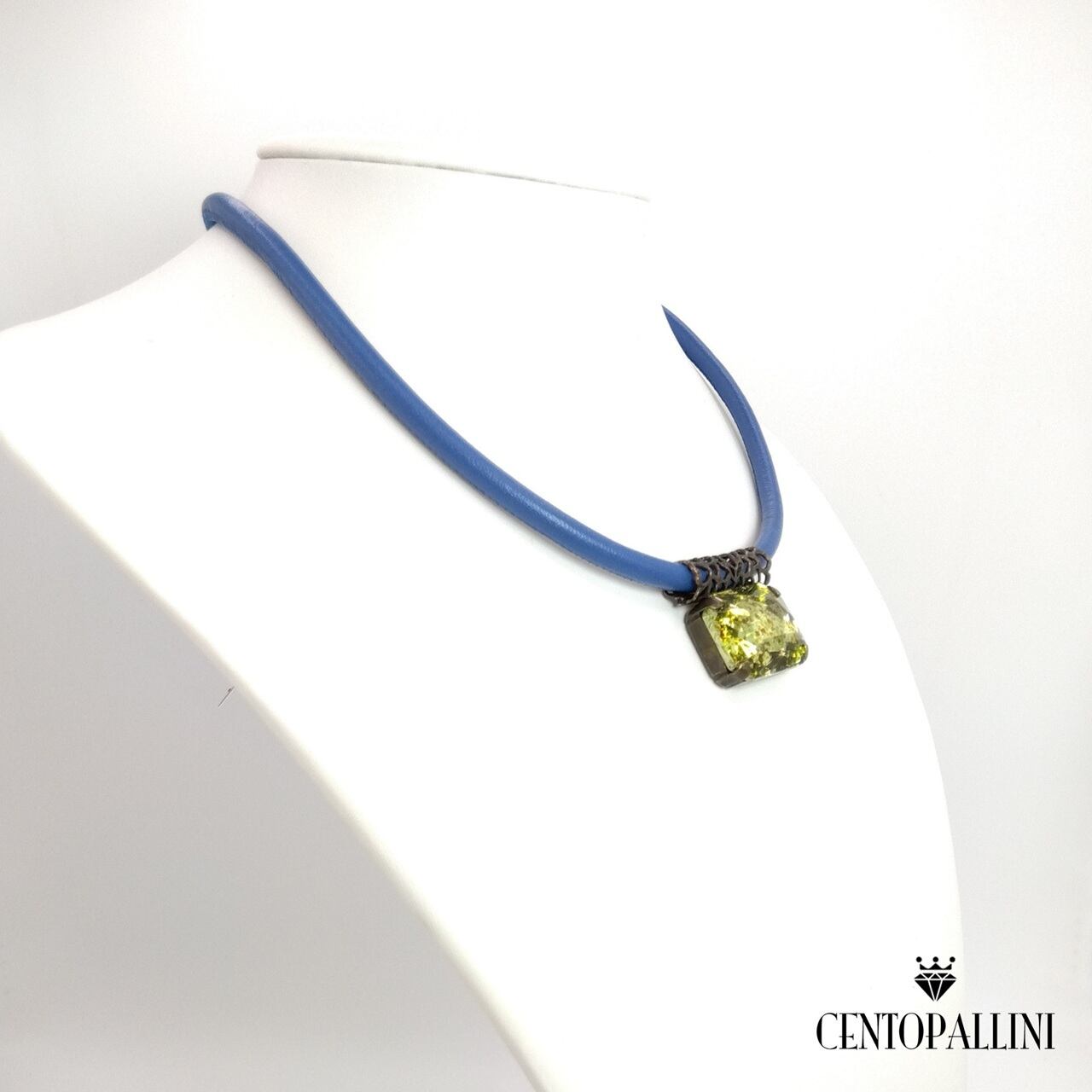 一粒の大きなスクエアクリスタルとレザーコードのショートネックレスです。