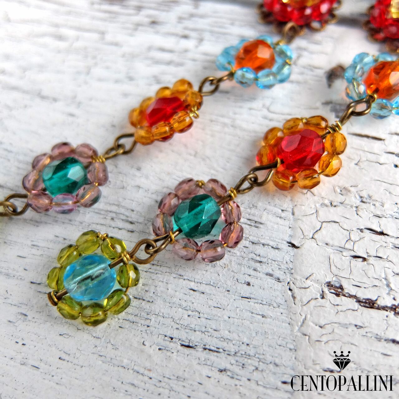 セミクリスタルチェコビーズの透明感を生かすために台座に留めつけずにつなげました。カラフルでしかもシンプルなデザインはどんなコーディネートにもマッチし、楽しさをプラスしてくれます。