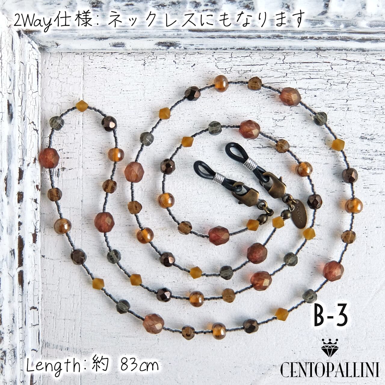 B-3 :約83cm / マット加工したブラウンチェコビーズやイングリッシュカットビンテージチェコビーズなどを合わせた美しいグラスコードです。シリコン製の眼鏡留めを外せばネックレスとしてお使いいただけます。