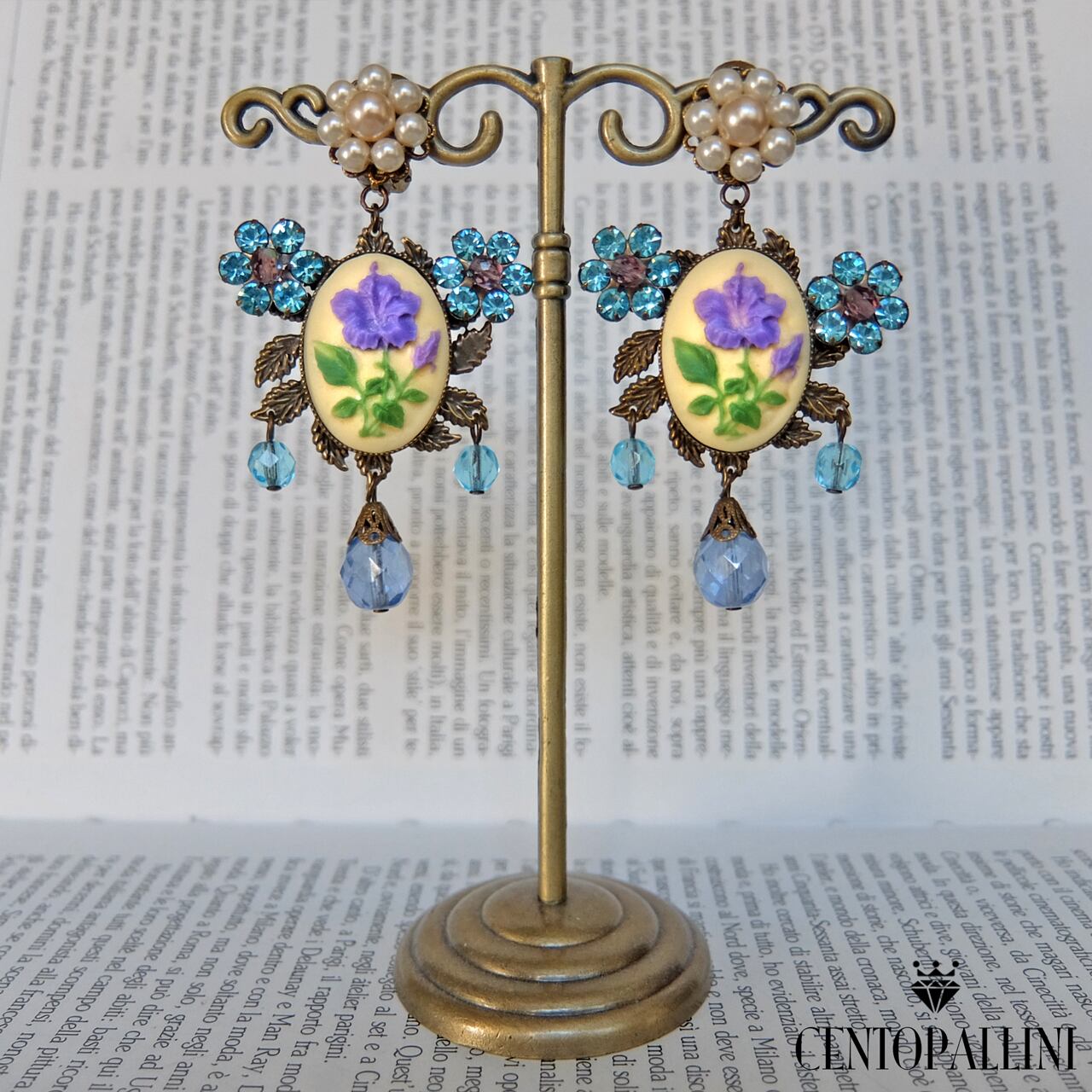 このフラワーカメオイヤリングは、美しい花モチーフのカメオをメインに、両脇にスワロのクリスタルでデザインされた小花モチーフを添えています。