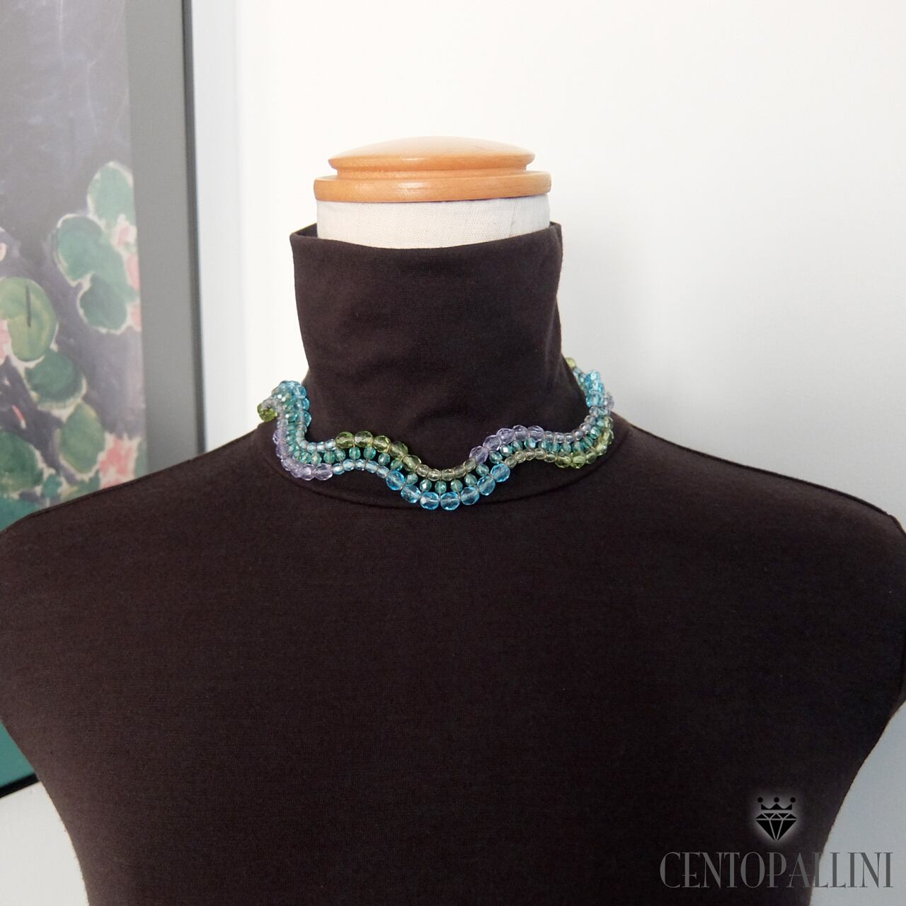 セミクリスタルチェコビーズを計算された組み合わせで首元に添うようにに仕上げています。