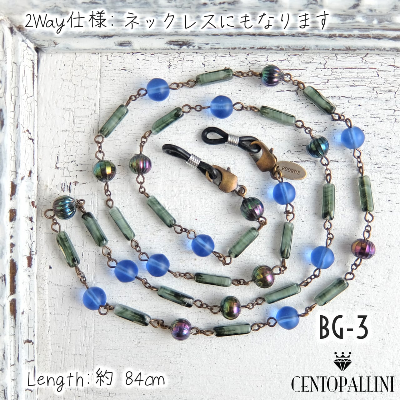 BG-3 :約84cm / チェコ産の長細いスクエアビンテージパーツと虹色に光るフランス産のビンテージビーズに、マットなブルーガラスビーズを合わせた大変美しいグラスコードです。パーツの一つ一つが個性的です。シリコン製の眼鏡留めを外せばネックレスとしてお使いいただけます。